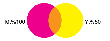 Örneğin, Turuncuyu elde etmek için Magenta(M) ve Yellow(Y) üst üste basılmalıdır.